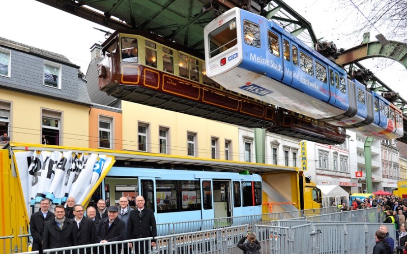 Renato Lobo | Via Trolebus Sistemas de Monotrilho não são tão recentes, como os em construção na cidade de São Paulo. O monotrilho suspenso da cidade alemã de Wuppertal foi fundado em 1901, e o Governo local apresentou as novas composições na semana passada no terminal Vohwinkel. A entrega do carro novo faz parte de um programa de modernização da frota para os próximos 20 anos. Os 31 trens estão sendo fabricados pela Vossloh, da Espanha, mesmo empresa que produz os Veículos Leves Sobre Trilhos da Baixada Santista. Já o sistema de sinalização fica por conta da Alstom, com a tecnologia “Atlas 400 ETCS Nível 2+”. Os trens possuem 24 metros de comprimento e pesa 25 toneladas, possuem iluminação LED e 46 assentos de madeira almofadadas. O testes dinâmicos começam em janeiro, com previsão para prestar serviços com passageiros em junho. O último trem deve ser entregue em 2017. Já as 25 composições fornecidos pela MAN entre 1972 e 1975 serão aposentadas. O trem suspenso transporta uma média de 57 mil passageiros por dia, percorre um trajeto de 13,3 km a uma velocidade média de 60 km/h.